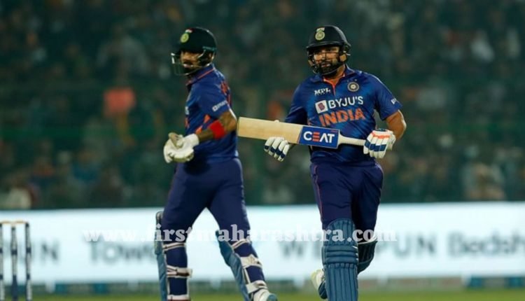 प्रत्युत्तरादाखल भारतीय संघाने सावध पण आश्वासक सुरुवात केली. रोहित शर्मा आणि लोकेश राहुल जोडीने पहिल्या विकेटसाठी ५० धावांची भागीदारी केली. या भागीदारीत रोहित शर्माने आक्रमक पवित्रा घेत काही चांगले फटके खेळले. सँटनरने लोकेश राहुलला आऊट करत भारताची सलामीची जोडी फोडली. राहुल १५ रन्स काढून माघारी परतला. यानंतर रोहित शर्माने आपला मुंबईकर साथीदार सूर्यकुमार यादवच्या सहाय्याने भारताच्या डावाला आकार दिला.