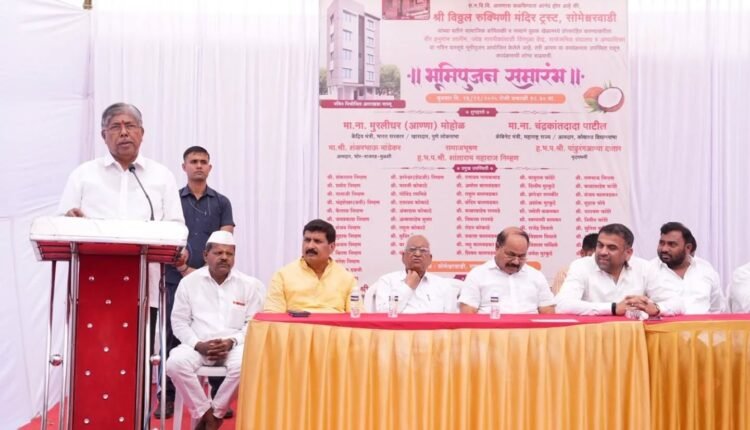 पुणे : कोथरूड मतदारसंघातील सोमेश्वरवाडी परिसरात श्री विठ्ठल-रुक्मिणी मंदिर ट्रस्टतर्फे लोकसहभागातून उभारण्यात येत असलेल्या वीर हनुमान तालीम, ज्येष्ठ नागरिकांसाठी विरंगुळा केंद्र, तसेच सार्वजनिक अभ्यासिका व ग्रंथालय या बहुउद्देशीय नूतन वास्तूचे भूमिपूजन उच्च व तंत्र शिक्षण मंत्री तथा कोथरूड मतदारसंघाचे आमदार चंद्रकांत पाटील यांच्या प्रमुख उपस्थितीत बुधवारी संपन्न झाले.