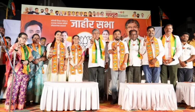 कोल्हापूर : कोल्हापूर जिल्ह्यातील हातकणंगले तालुक्यातील तारदाळ येथे कोरोची जिल्हा परिषद गट आणि तारदाळ पंचायत समिती गणातील भाजपा महायुती उमेदवारांच्या प्रचारार्थ जाहीर सभेत उच्च व तंत्र शिक्षण मंत्री चंद्रकांत पाटील यांनी मतदारांशी संवाद साधला.