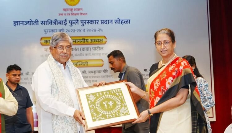 मुंबई : उच्च व तंत्र शिक्षण विभागातर्फे २०२३–२४ आणि २०२४–२५ या वर्षांसाठी जाहीर करण्यात आलेल्या ज्ञानज्योती सावित्रीबाई फुले पुरस्कारांचा वितरण समारंभ एसएनडीटी महिला विद्यापीठाच्या सर सिताराम तथा लेडी शांताबाई पारकर दीक्षान्त सभागृहात उच्च व तंत्र शिक्षण मंत्री चंद्रकांत पाटील यांच्या प्रमुख उपस्थितीत पार पडला. राज्यातील महिला सक्षमीकरणाला चालना देण्यासाठी शासनाकडून विविध योजना प्रभावीपणे राबविण्यात येत आहेत. उच्च व तंत्र शिक्षणासाठी मुलींचे शिक्षण शुल्क माफ केल्यामुळे सकारात्मक बदल घडून येत असून मुलींच्या प्रवेशात लक्षणीय वाढ होत आहे असे चंद्रकांत पाटील यांनी सांगितले.